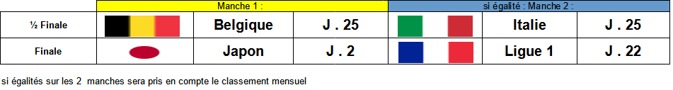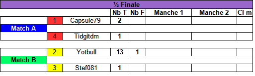 Suite au retrait de Arnlef dans la catégorie ceinture Marron .... il n'y aura pas de finale ce week-end et du coup les 2 vainqueurs des 1/2 finales gagneront leur ceintures Orange