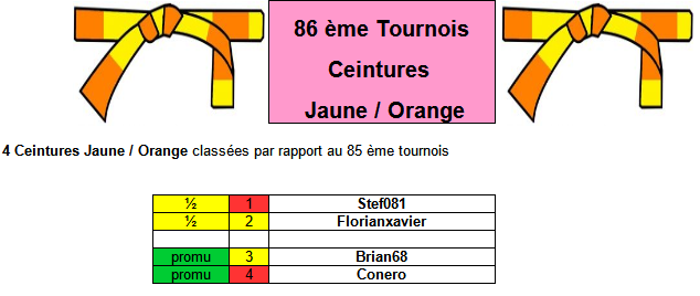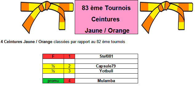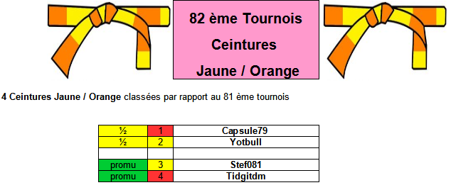 Pour chaque Tournois on aura 4 ceintures Jaune / Orange classées dans l'ordre du tournois précédent :