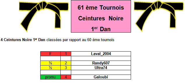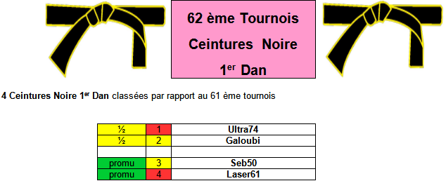 Pour chaque Tournois on aura 4 ceintures Noire 1er Dan classées dans l'ordre du tournois précédent :