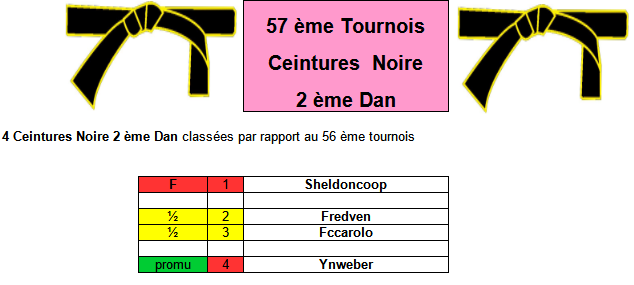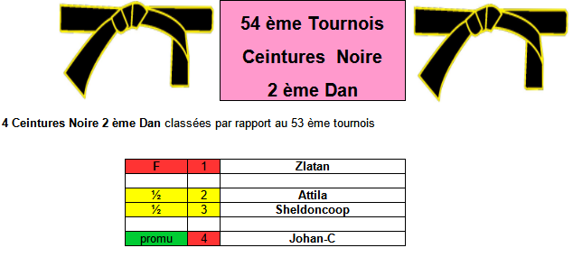 Pour chaque Tournois on aura 4 ceintures Noire 2 ème Danclassées dans l'ordre du tournois précédent :