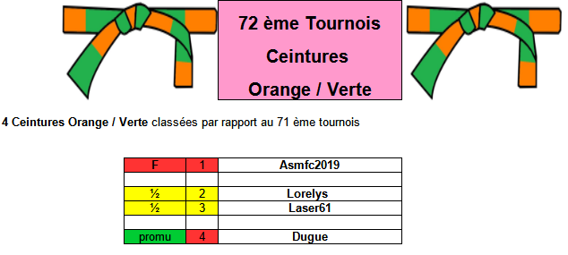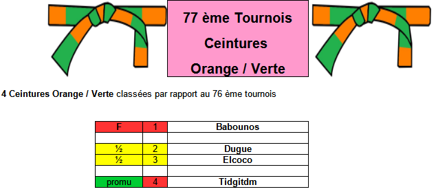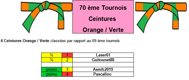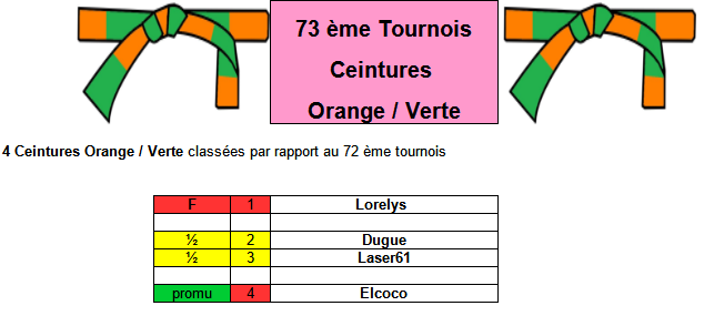 Pour chaque Tournois on aura 4 ceintures Orange / Verte classées dans l'ordre du tournois précédent :