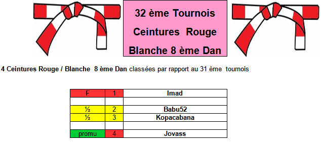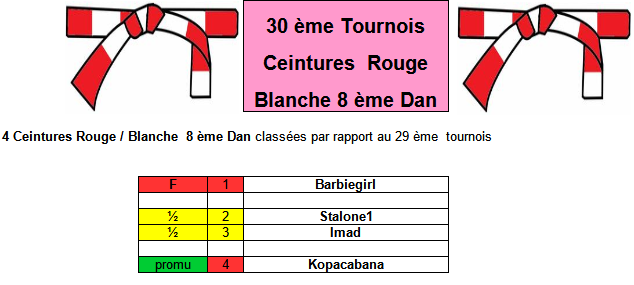 Pour chaque Tournois on aura 4 ceintures Rouge / Blanche 8 ème Dan classées dans l'ordre du tournois précédent :