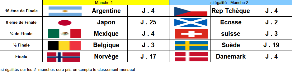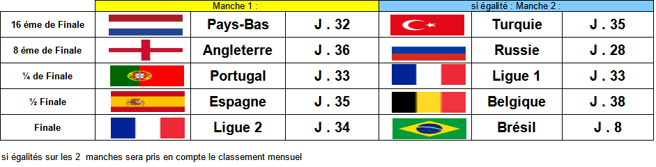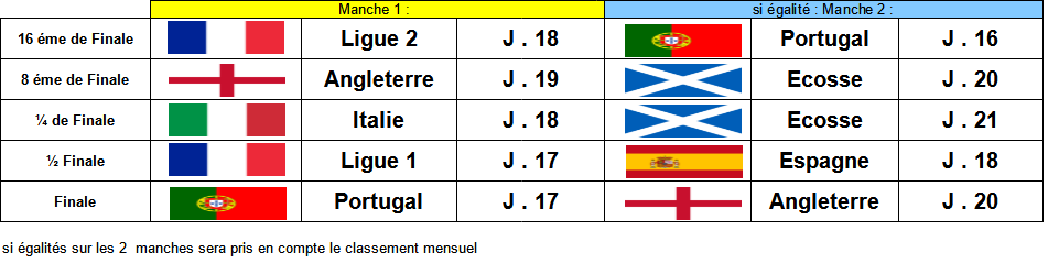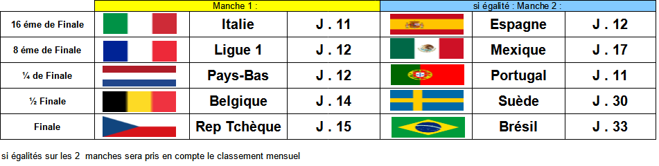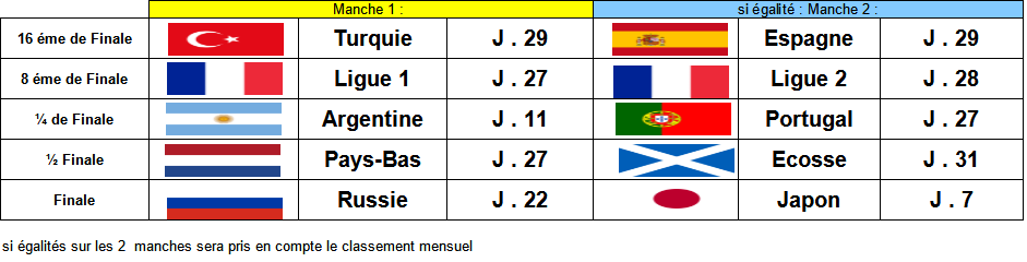 Le Vainqueur obtiendra 30 points et le Finaliste 20 points ... 1/2 finaliste 15 points .... 1/4 finaliste 10 points .... 1/8 finaliste 8 points .... 16ème finaliste 5 points