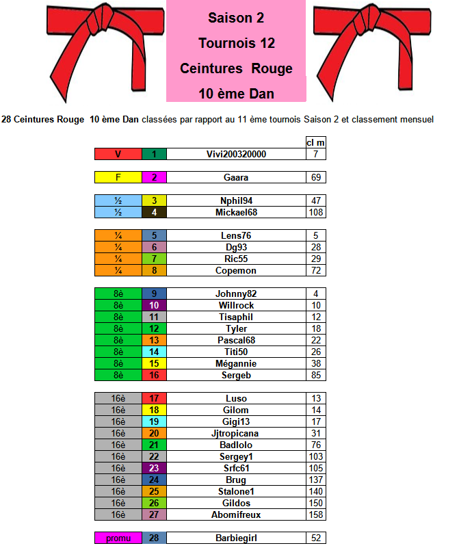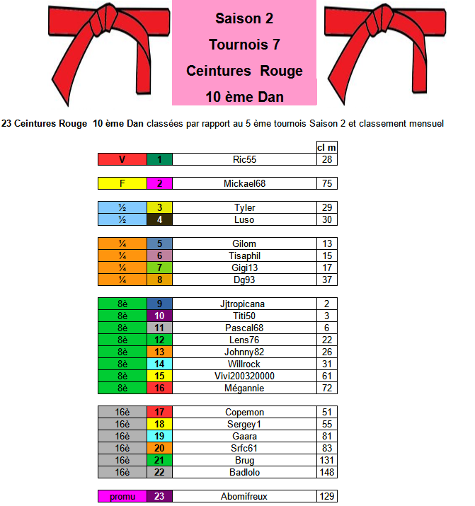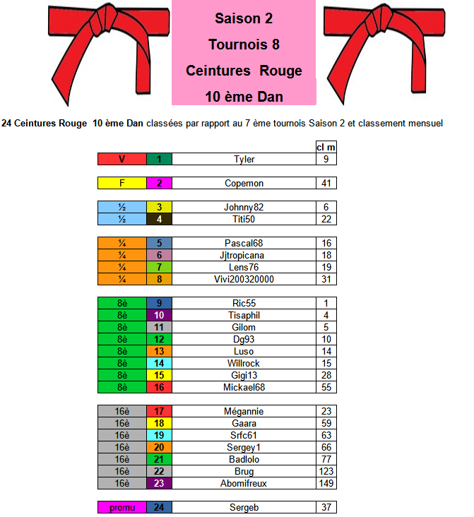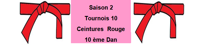 à chaque tournois on ajoute le dernier ceinture rouge 10 ème Dan .... donc en fonction du nombre de joueurs il y aura des excemps de 1er tour et le tournoi sera organisé en fonction du tournoi précédent